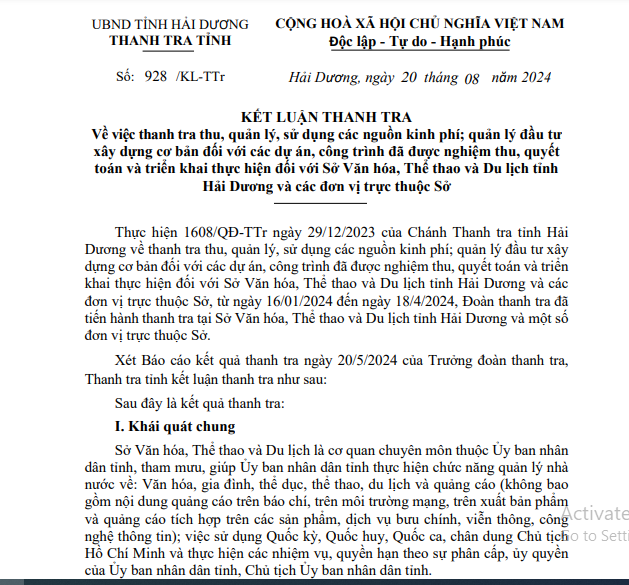 Kết luận thanh tra số 928/KL-TTr về việc thanh tra thu, quản lý, sử dụng các nguồn kinh phí; quản lý đầu tư xây dựng cơ bản đối với các dự án, công trình đã được nghiệm thu, quyết toán và triển khai thực hiện đối với Sở Văn hóa, Thể thao và Du lịch tỉnh Hải Dương và các đơn vị trực thuộc Sở.