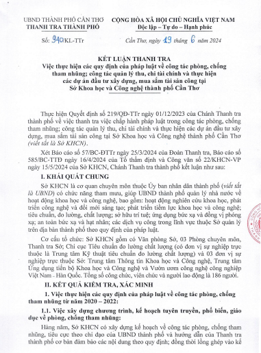 Kết luận thanh tra số 940/KL-TTr ngày 19/6/2024 việc thực hiện các quy định của pháp luật về công tác phòng, chống tham nhũng; công tác quản lý thu, chi tài chính và thực hiện các dự án đầu tư xây dựng, mua sắm tài sản công tại Sở Khoa học và Công nghệ Cần Thơ