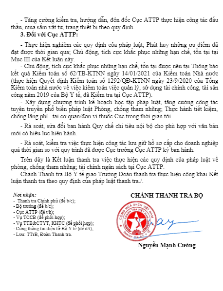 Sau quá trình thanh tra, Thanh tra Bộ Y tế chỉ ra hàng loạt tồn tại, hạn chế khi thực hiện các quy định của pháp luật về phòng, chống tham nhũng (PCTN); tài chính ngân sách tại Cục An toàn thực phẩm (ATTP). Chánh Thanh tra Bộ Y tế kiến nghị Cục ATTP thực hiện nghiêm các quy định của pháp luật; phát huy những ưu điểm đã đạt được, chủ động khắc phục những hạn chế, tồn tại.