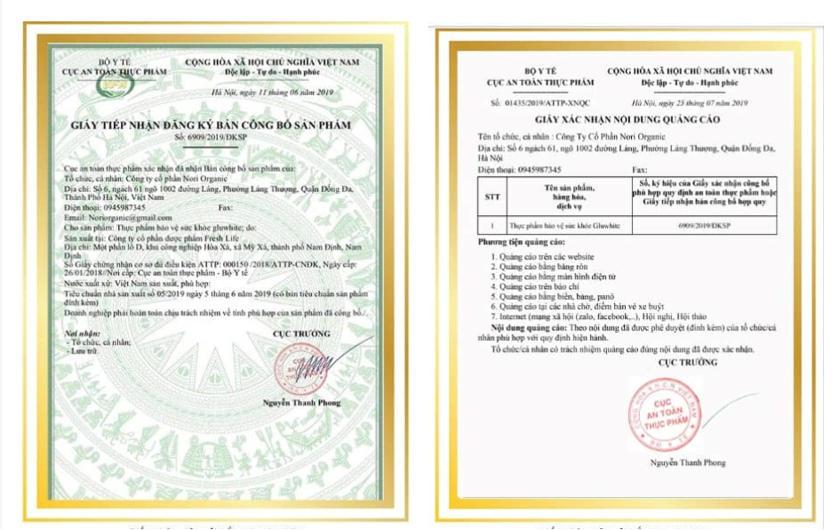 Giấy tiếp nhận đăng ký công bố sản phẩm/Giấy xác nhận nội dung quảng cáo do Cục ATTP cấp cho Công ty CP Nori OrganicĐối với các hoạt chất Glutathione, Collagen được quảng cáo là các chất tốt cho da, tuy nhiên các hoạt chất này khi tiêu thụ và đưa vào cơ thể nhiều hơn mức hàng ngày cho phép như những sản phẩm sử dụng nhiều hoạt chất này và được pha trộn thêm tạp chất sẽ gây ảnh hưởng tới sức khỏe, nếu sử dụng không đúng liều lượng trong thời gian dài có thể gây ảnh hưởng tới nội tạng.