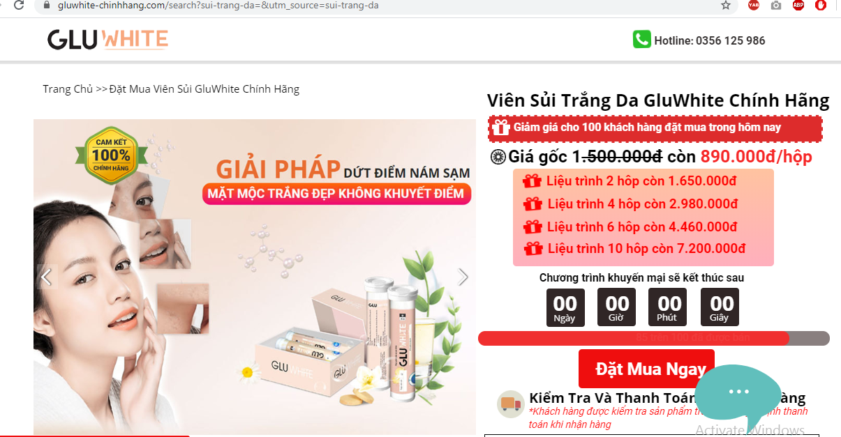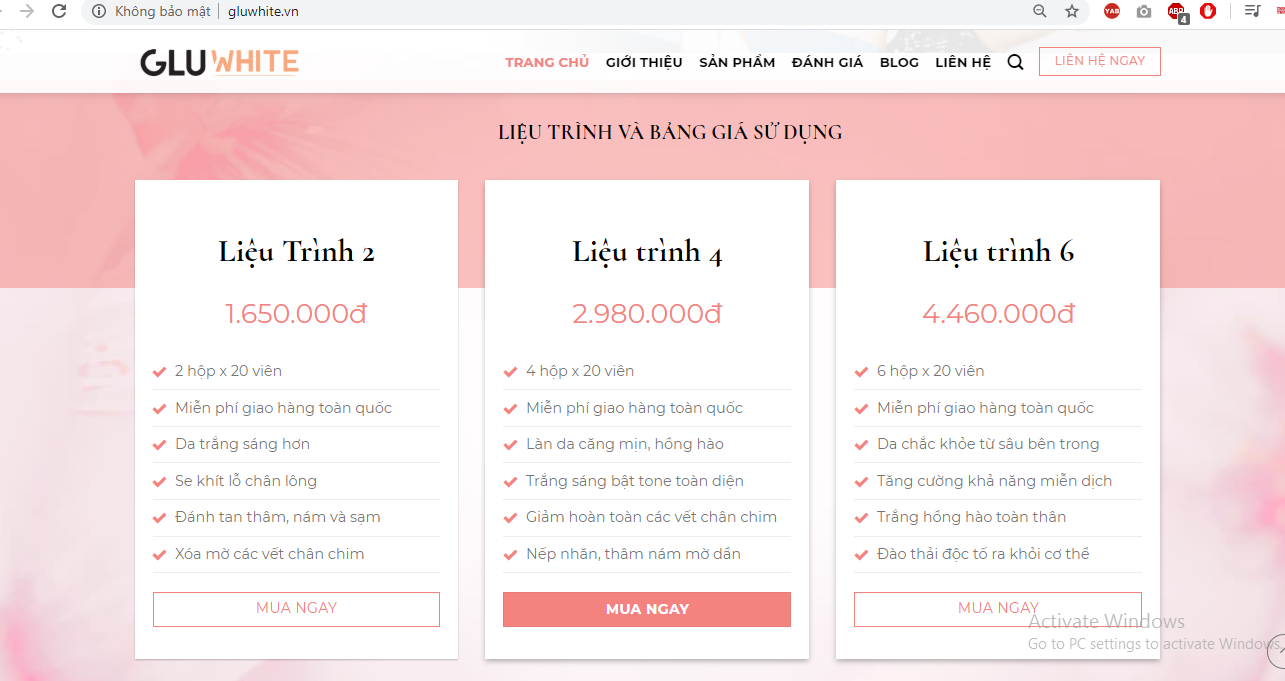 Sản phẩm Gluwhite được thổi phồng công dụng ra sao: Từ 3 đến 7 ngày hoạt chất Glutathione bắt đầu thẩm thấu sâu bên trong và đào thải độc tố dưới da ra ngoài; Từ 15 đến 25 ngày các hắc tố melanin được đào thải 40%. Nếp thâm, nếp nhăn nám mờ dần; Từ 25 đến 30 ngày sắc tố melanin đen chuyển thành sắc tố melanin trắng. Làn da trắng bật tông, hồng hào toàn diện từ bên trong…Cùng với đó, khách hàng được giới thiệu các liệu trình tương ứng với giá 1.650.000đ - 2.980.000đ – 4.460.000đ.