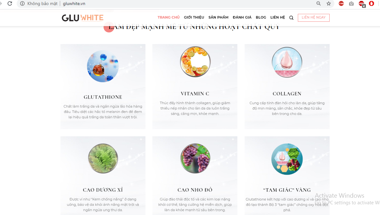 Tại các kênh quảng cáo kể trên, sản phẩm Gluwhite được giới thiệu làm trắng da từ bên trong với công nghệ viên sủi chứa Glutathione tiên tiến hàng đầu tại Việt Nam, có công dụng đẩy lùi lão hoá, trẻ hoá làn da nhờ hấp thụ Glutathione vào sâu trong tế bào.