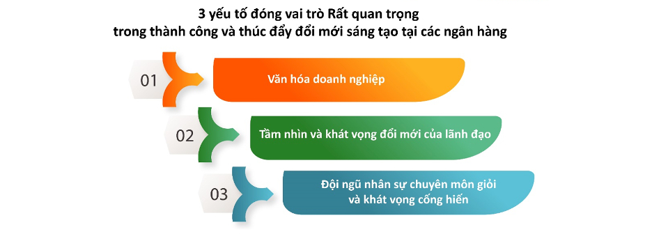 Ngoài việc sáng tạo trong sản phẩm/dịch vụ hướng tới khách hàng, ngay trong bản thân nội bộ các ngân hàng VIE10 cũng rất chú trọng đến việc xây dựng văn hoá sáng tạo cách tân. Khảo sát của Viet Research cho thấy có đến 68% các ngân hàng cho biết 3 yếu tố đóng vai trò rất quan trọng trong thành công và thúc đẩy đổi mới sáng tạo tại các ngân hàng đó là: Văn hoá doanh nghiệp, tầm nhìn và khát vọng đổi mới của lãnh đạo, đội ngũ nhân sự chuyên môn giỏi và khát vọng cống hiến.
