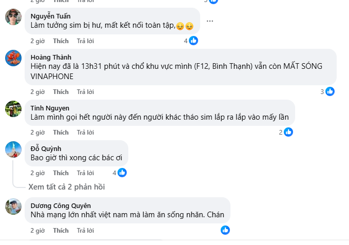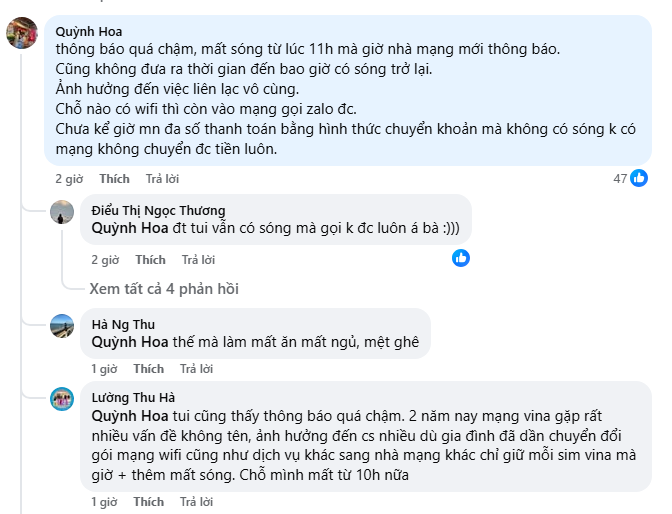Ngay bên dưới bài đăng, nhiều người cho biết mình là khách hàng của VinaPhone, đồng thời tỏ ra bức xúc trước quy trình xử lý sự cố mất sóng của nhà mạng này. Tài khoản Quỳnh Hoa cho biết: "Thông báo quá chậm, mất sóng từ lúc 11 giờ mà giờ nhà mạng mới thông báo, cũng không đưa ra thời gian đến bao giờ có sóng trở lại ảnh hưởng đến việc liên lạc vô cùng. Chỗ nào có wifi thì còn vào mạng gọi zalo được, chưa kể giờ mọi người đa số thanh toán bằng hình thức chuyển khoản mà không có sóng không có mạng không chuyển được tiền luôn".