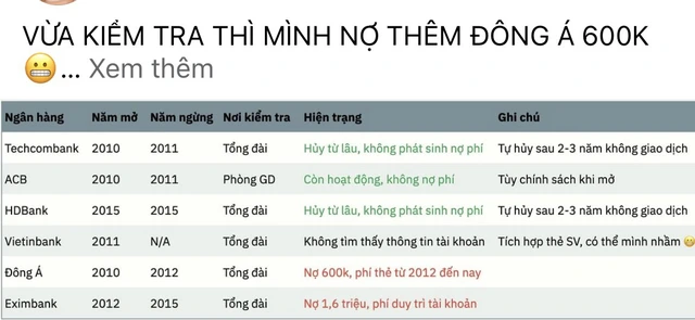 Anh Nguyễn Văn Ban (Ba Đình, Hà Nội) chia sẻ, sau vụ nợ phí quản lý tài khoản Eximbank thì tôi đã gọi hết các ngân hàng từng mở từ năm 2008 tới giờ để kiểm tra. Cuối cùng là nợ ngân hàng Đông Á 600.000 đồng phí thường niên thẻ từ năm 2012 và nợ ngân hàng Eximbank 1,6 triệu phí duy trì tài khoản. Qua đó tôi khuyên mọi người nên gọi trực tiếp lên tổng đài từng ngân hàng để kiểm tra cho chắc chắn".