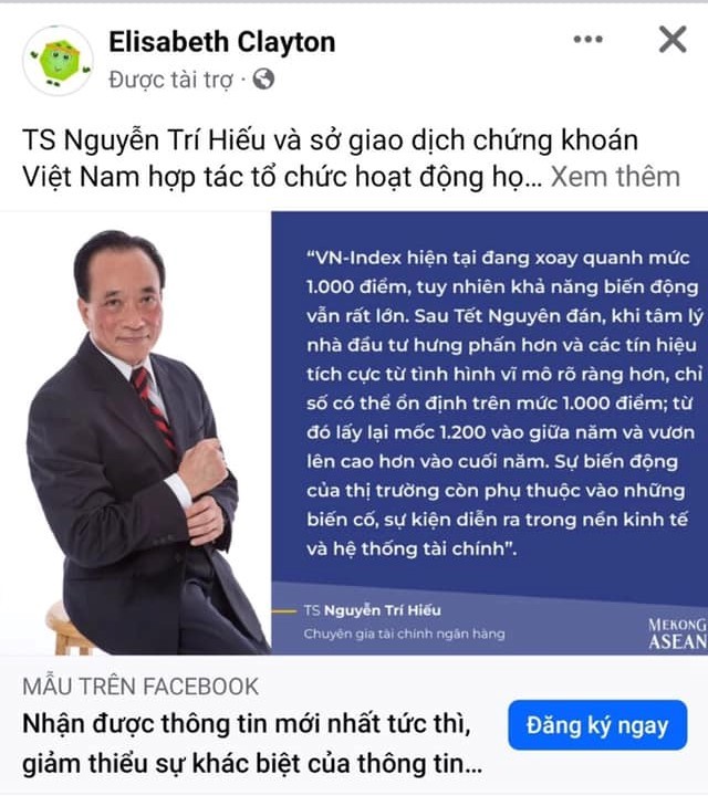 Cụ thể, trên một trang facebook giả mạo TS Nguyễn Trí Hiếu viết bài quảng cáo: “Tôi hợp tác với Sở Giao dịch Chứng khoán Việt Nam ra mắt “Cộng đồng nhà đầu tư", bắt đầu từ tháng 12, chúng tôi sẽ mời 20 nhà phân tích chứng khoán nổi tiếng đến giảng dạy trực tuyến miễn phí.