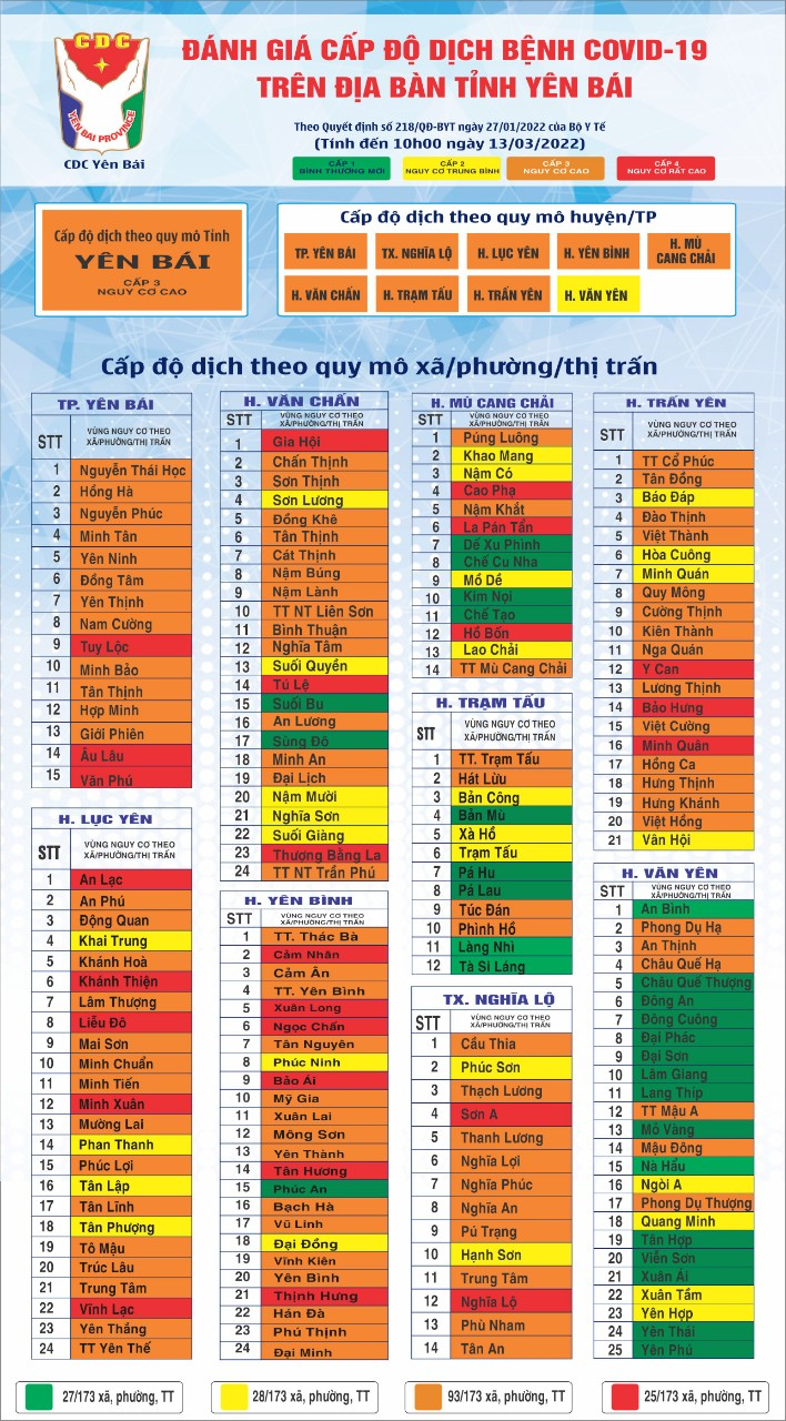 Ngoại trừ huyện Văn Yên ở cấp độ dịch màu vàng, các huyện còn lại của tỉnh Yên Bái đều ở cấp độ dịch màu cam gồm: thành phố Yên Bái, thị xã Nghĩa Lộ, huyện Trạm Tấu, huyện Mù Cang Chải, huyện Yên Bình, huyện Lục Yên, huyện Trấn Yên, huyện Yên Bình.