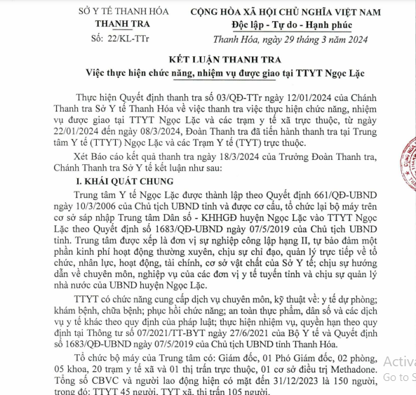 Kết luận thanh tra về việc thực hiện chức năng, nhiệm vụ được giao tại Trung tâm Y tế huyện Ngọc Lặc