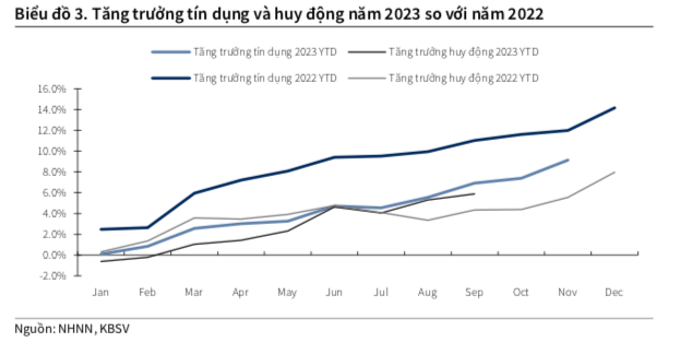 Theo báo cáo của Công ty Cổ phần Chứng khoán KB Việt Nam (KBSV), đơn vị này đặt kỳ vọng mặt bằng lãi suất thấp ở thời điểm cuối năm 2023 sẽ tiếp tục được duy trì trong năm sau, từ đó tạo động lực thúc đẩy tín dụng và cải thiện chi phí vốn cho các ngân hàng.
