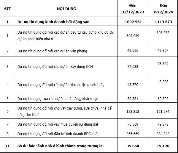 Trong đó, dư nợ tín dụng đối với các dự án đầu tư xây dựng khu đô thị, dự án phát triển nhà ở giảm từ 305.650 tỷ đồng vào cuối năm 2023 xuống còn 303.572 tỷ đồng; dư nợ tín dụng đối với các dự án văn phòng giảm từ 42.596 tỷ đồng xuống 42.367 tỷ đồng; dư nợ tín dụng đối với các dự án xây dựng khu công nghiệp, khu chế xuất tăng từ 77.033 tỷ đồng lên 78.349 tỷ đồng; dư nợ tín dụng đối với các dự án khu du lịch, sinh thái, nghỉ dưỡng giảm từ 43.570 tỷ đồng xuống 43.393 tỷ đồng; dư nợ tín dụng của các dự án nhà hàng, khách sạn tăng từ 59.581 tỷ đồng lên 60.502 tỷ đồng;