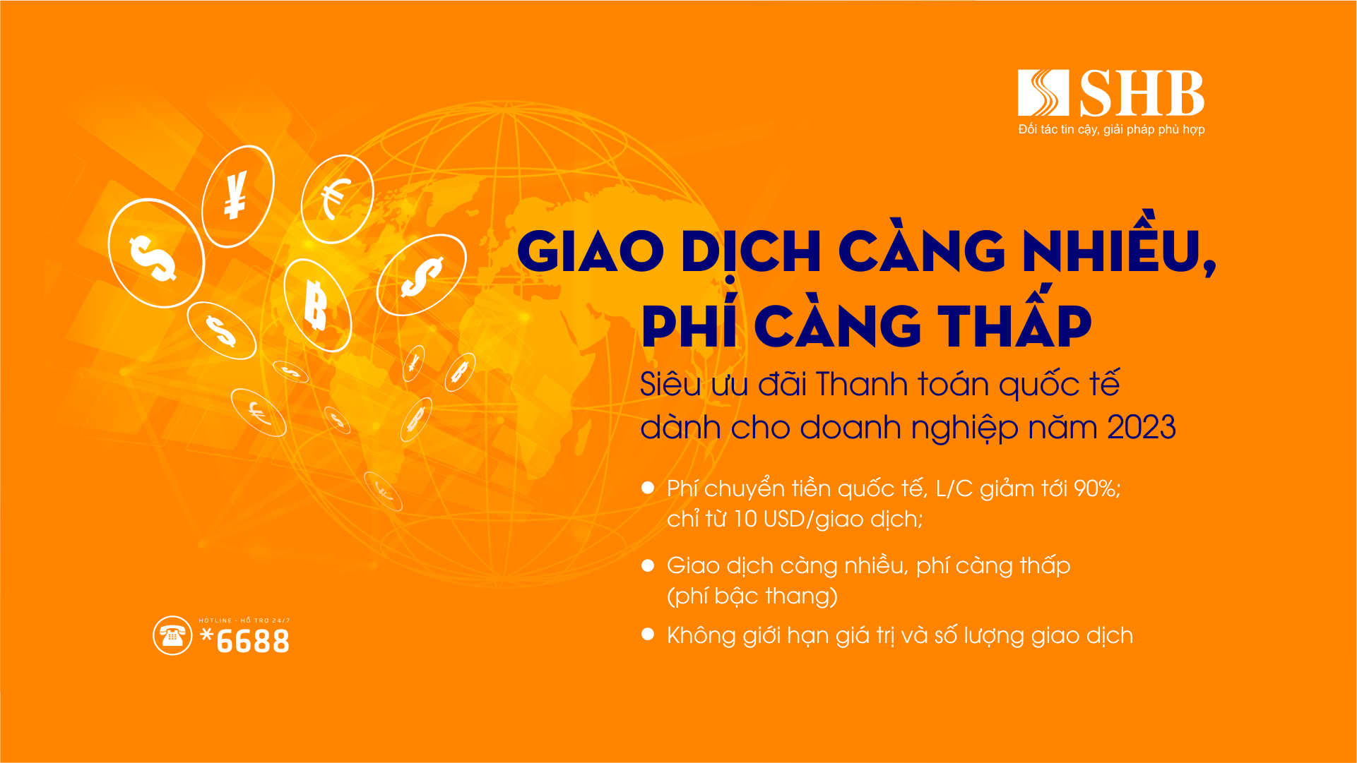 Với mong muốn góp phần thúc đẩy phát triển thương mại toàn cầu cũng như nắm bắt được nhu cầu của các khách hàng thường xuyên sử dụng dịch vụ thanh toán quốc tế, từ nay đến hết ngày 31/12/2023, Ngân hàng Sài Gòn – Hà Nội (SHB) dành nhiều ưu đãi dành cho khách hàng cá nhân và doanh nghiệp khi chuyển tiền quốc tế, thanh toán L/C...