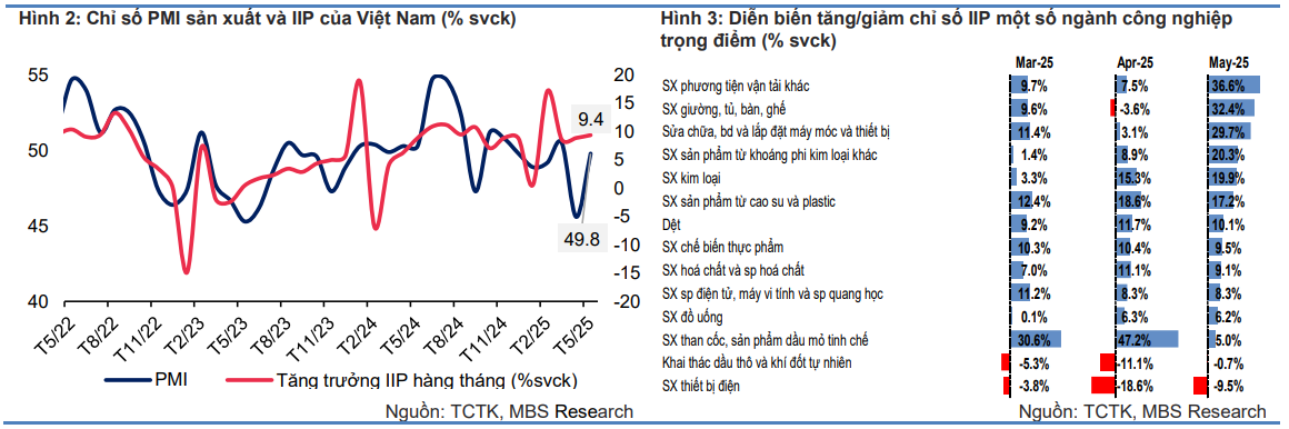 Theo Báo cáo, chỉ số sản xuất công nghiệp (IIP) tháng 5 tăng 4.3% so với tháng trước và tăng 9.4% so với cùng kỳ (svck). Trong đó ngành công nghiệp chế biến, chế tạo tiếp tục duy trì mức tăng trưởng 2 chữ số tháng thứ tư liên tiếp với mức tăng 11% svck trong tháng 5. Các ngành trọng điểm ghi nhận hoạt động sản xuất tăng trưởng mạnh trong tháng bao gồm: sản xuất phương tiện vận tải khác (+36.6% svck); sản xuất giường, tủ, bàn, ghế (+32.4% svck); sửa chữa, bảo dưỡng và lắp đặt máy móc và thiết bị (+29.7% svck).
