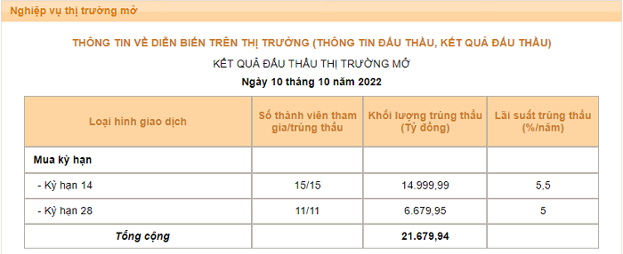 Trong phiên giao dịch ngày 10/10, Ngân hàng Nhà nước (NHNN) chào mua thành công gần 21.700 giấy tờ có giá với kỳ hạn dài 14 và 28 ngày, thay vì 7 ngày như trước đó. Lãi suất trúng thầu chỉ ở mức 5,5%/năm với kỳ hạn 14 ngày và 5%/năm với kỳ hạn 28 ngày.