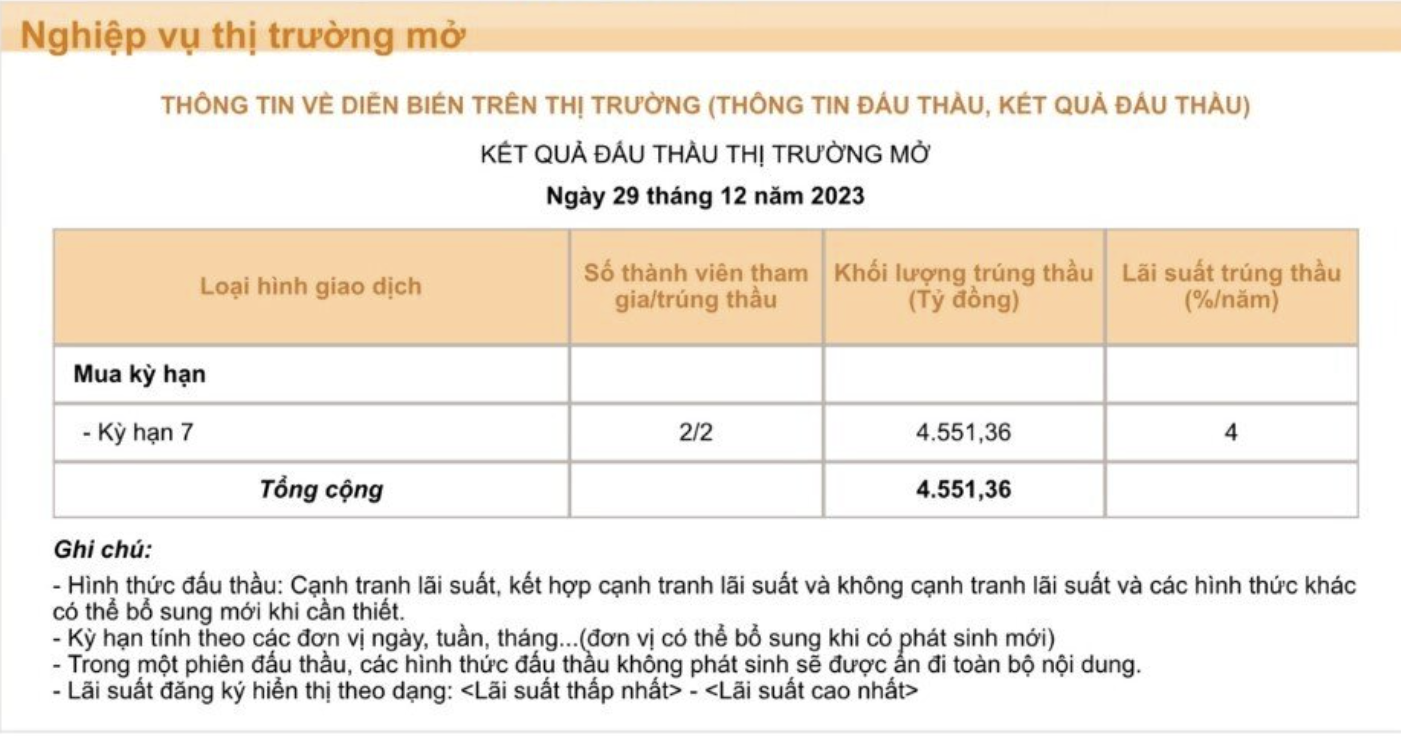 Trong phiên giao dịch cuối cùng của năm 2023 (29/12), Ngân hàng Nhà nước (NHNN) đã cho hai thành viên vay hơn 4.551 tỷ đồng thông qua kênh cho vay cầm cố giấy tờ có giá (OMO) với lãi suất 4%/năm và kỳ hạn 7 ngày. Đây là lần đầu tiên kể từ tháng 6/2023 kênh cho vay cầm cố giấy tờ có giá phát sinh giao dịch mới.