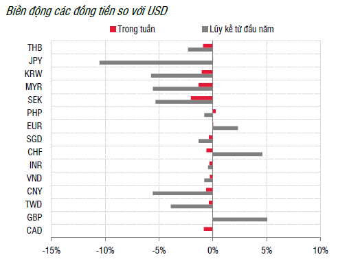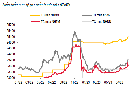 Giải thích cho biến động trên, việc duy trì chính sách tiền tệ phân kỳ với các NHTW lớn trên thế giới là yếu tố tạo ra áp lực lớn hơn đối với tỷ giá trong Quý 3 và khiến tỷ giá biến động mạnh. Bên cạnh đó, so với cuối năm 2022, mặc dù VND mất giá 0,8% so với USD, VND lại tăng giá tương đối nhiều so với các đồng tiền thương mại chủ chốt khác như JPY, THB, TWD hay KRW và khiến áp lực lên tiền Đồng cũng lớn hơn.