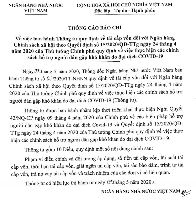 Ngày 07/5 Ngân hàng Nhà nước đã ban hành Thông tư 05/2020/TT-NHNN quy định về tái cấp vốn đối với Ngân hàng Chính sách xã hội theo Quyết định số 15/2020/QĐ-TTg ngày 24 tháng 4 năm 2020 của Thủ tướng Chính phủ quy định về việc thực hiện các chính sách hỗ trợ người dân gặp khó khăn do đại dịch COVID-19.