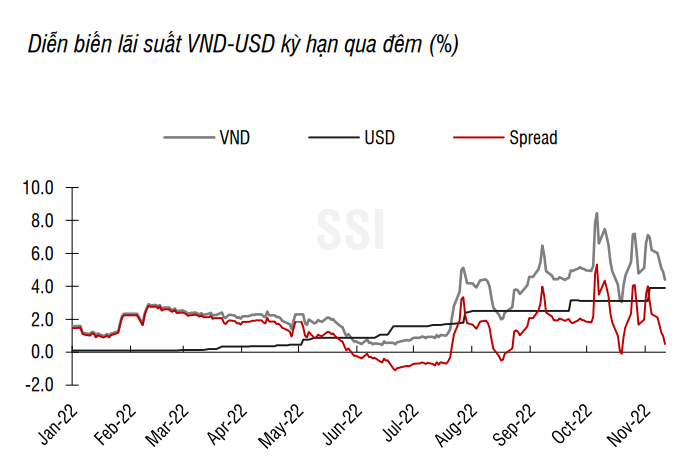 Mặt bằng lãi suất liên ngân hàng đã giảm nhiệt tương đối mạnh, xuống chỉ còn 4,4% ở kỳ hạn qua đêm (giảm 160 điểm so với tuần trước đó) và khiến cho chênh lệch giữa lãi suất VND và USD bị thu hẹp đáng kể.