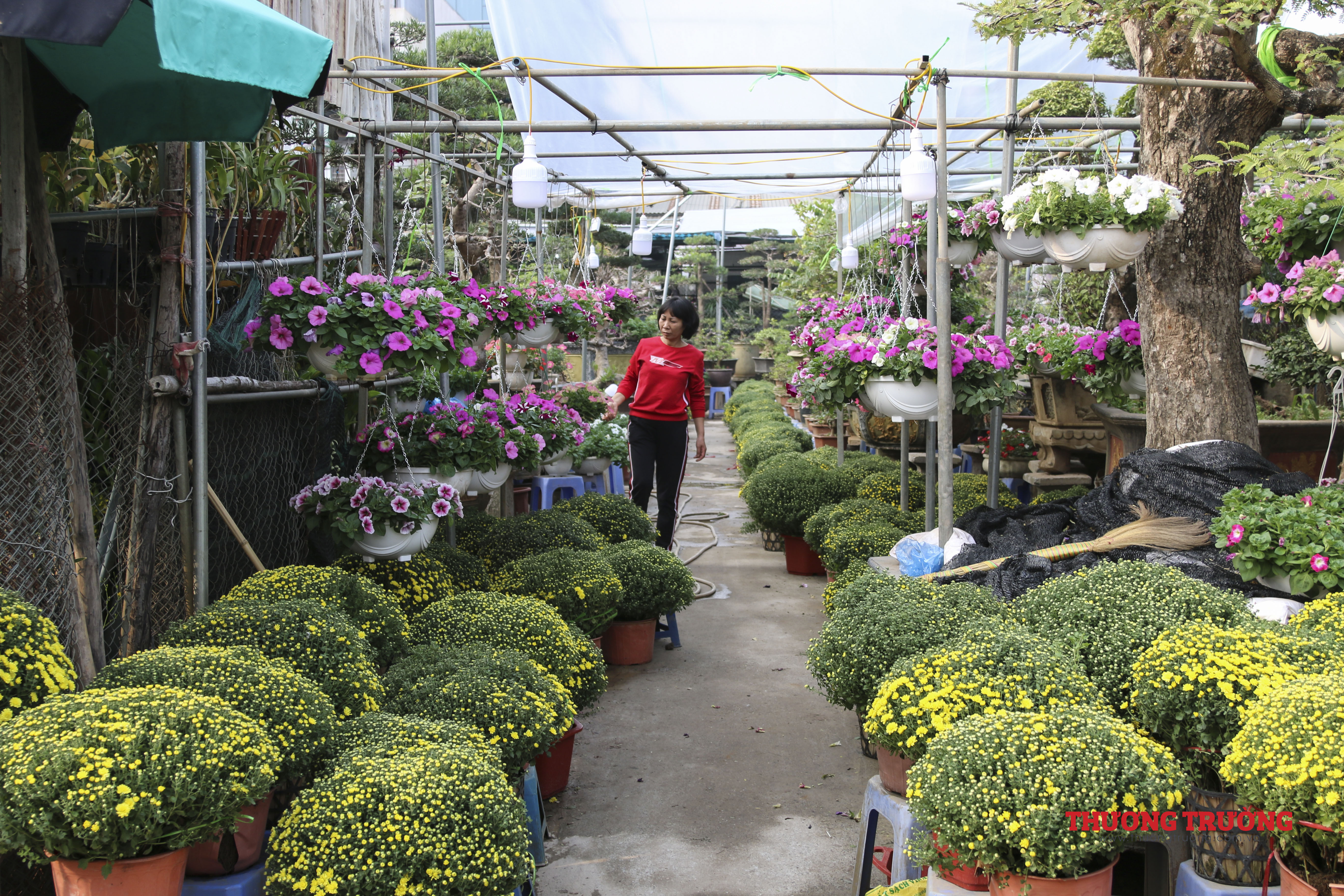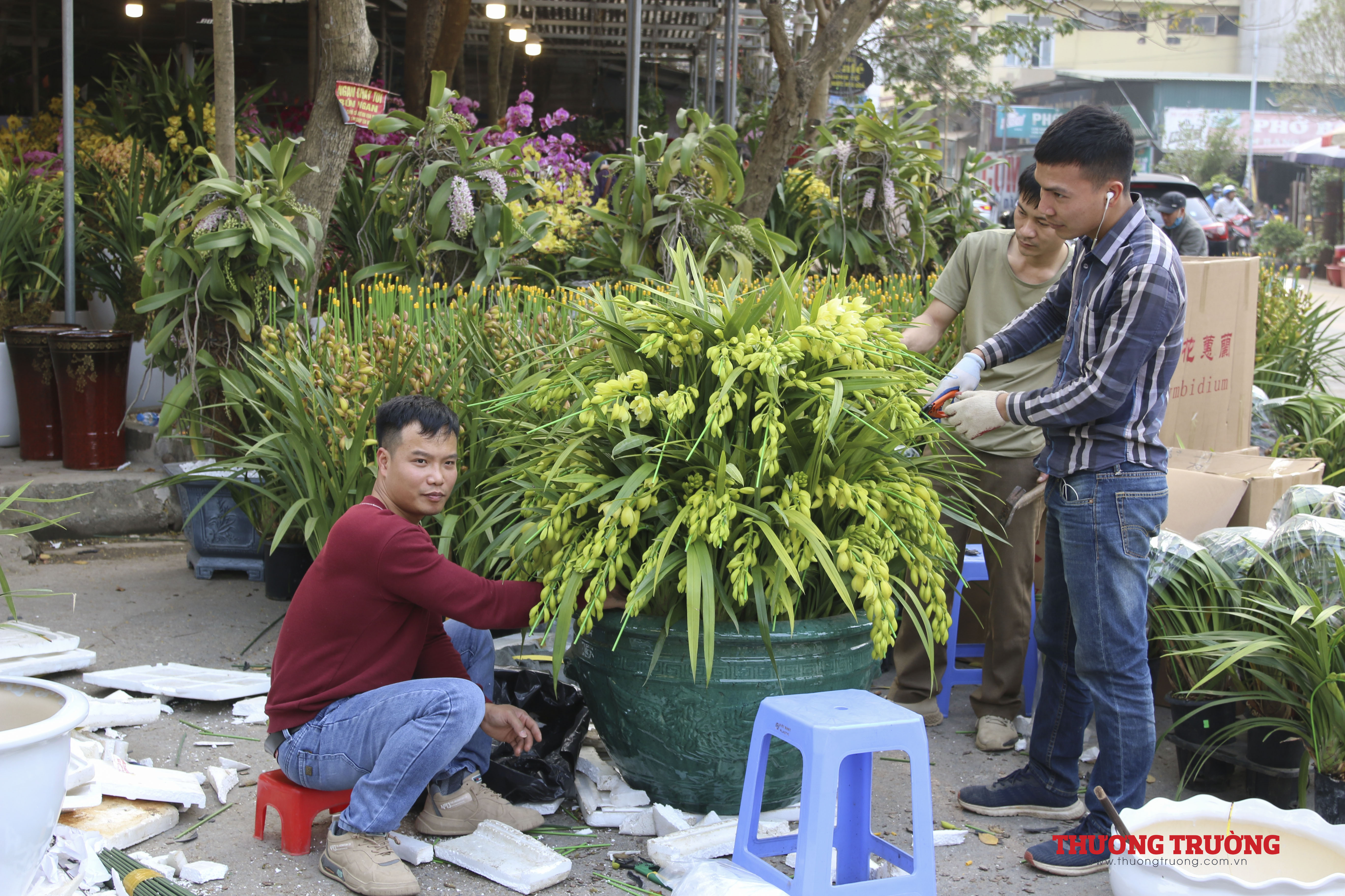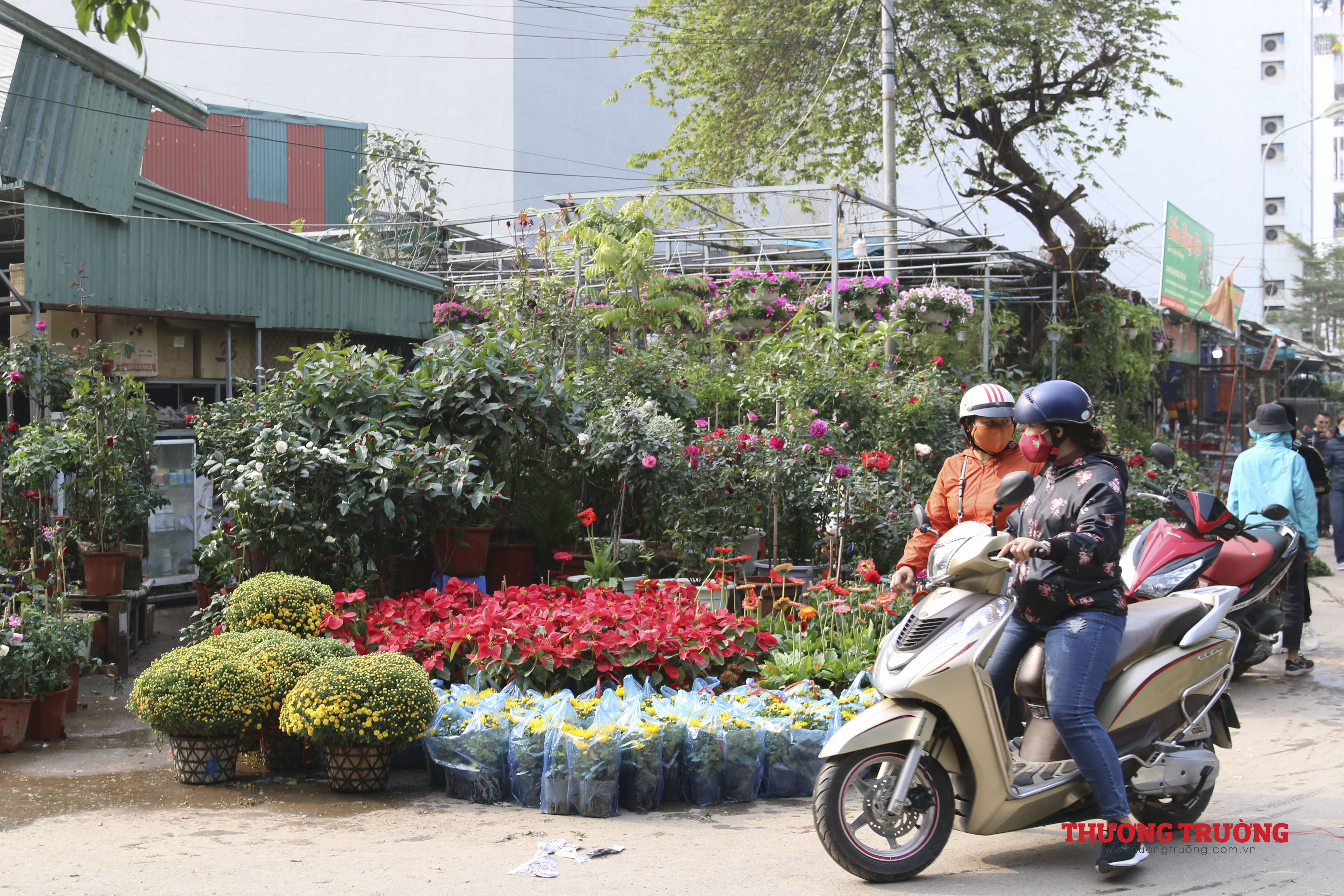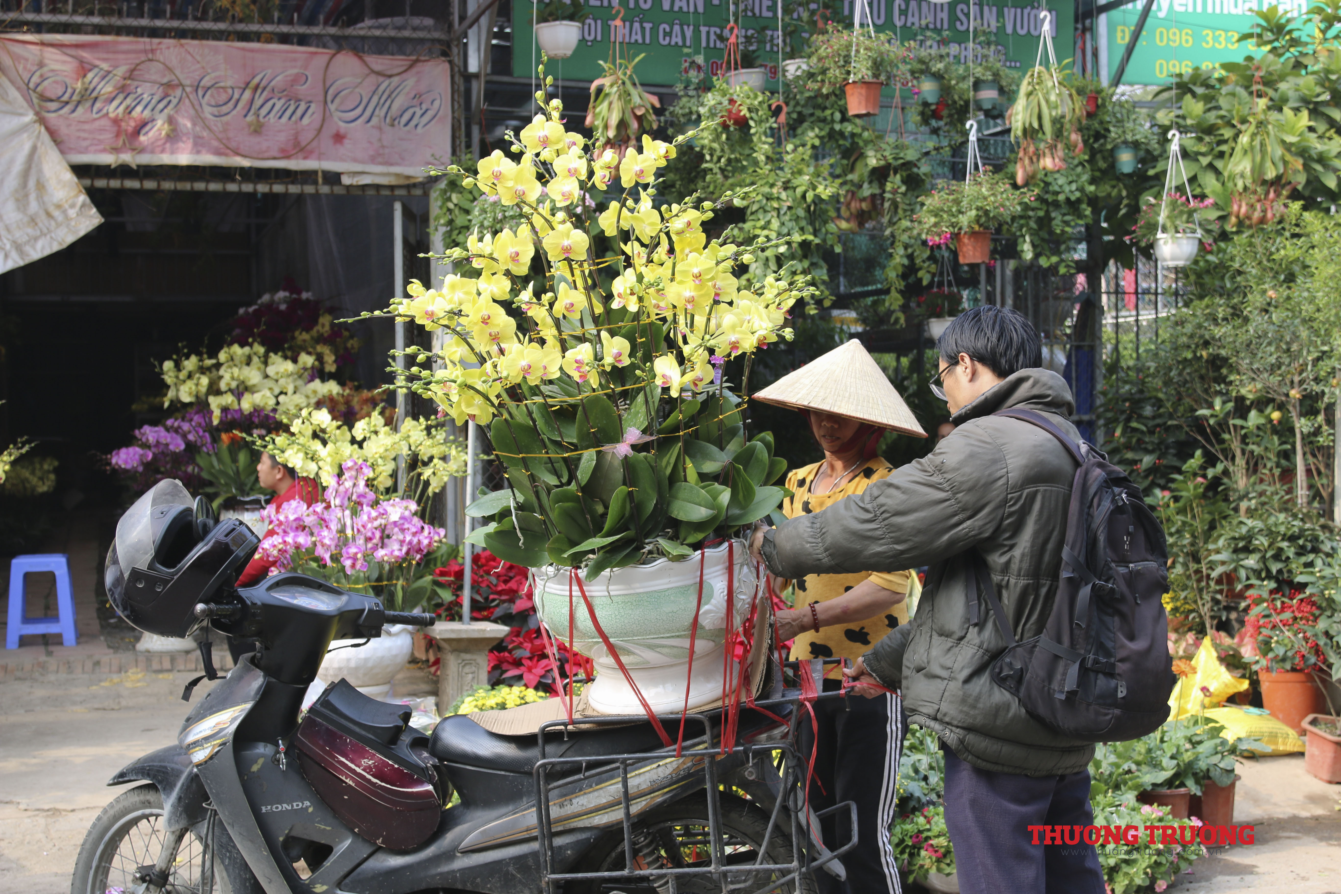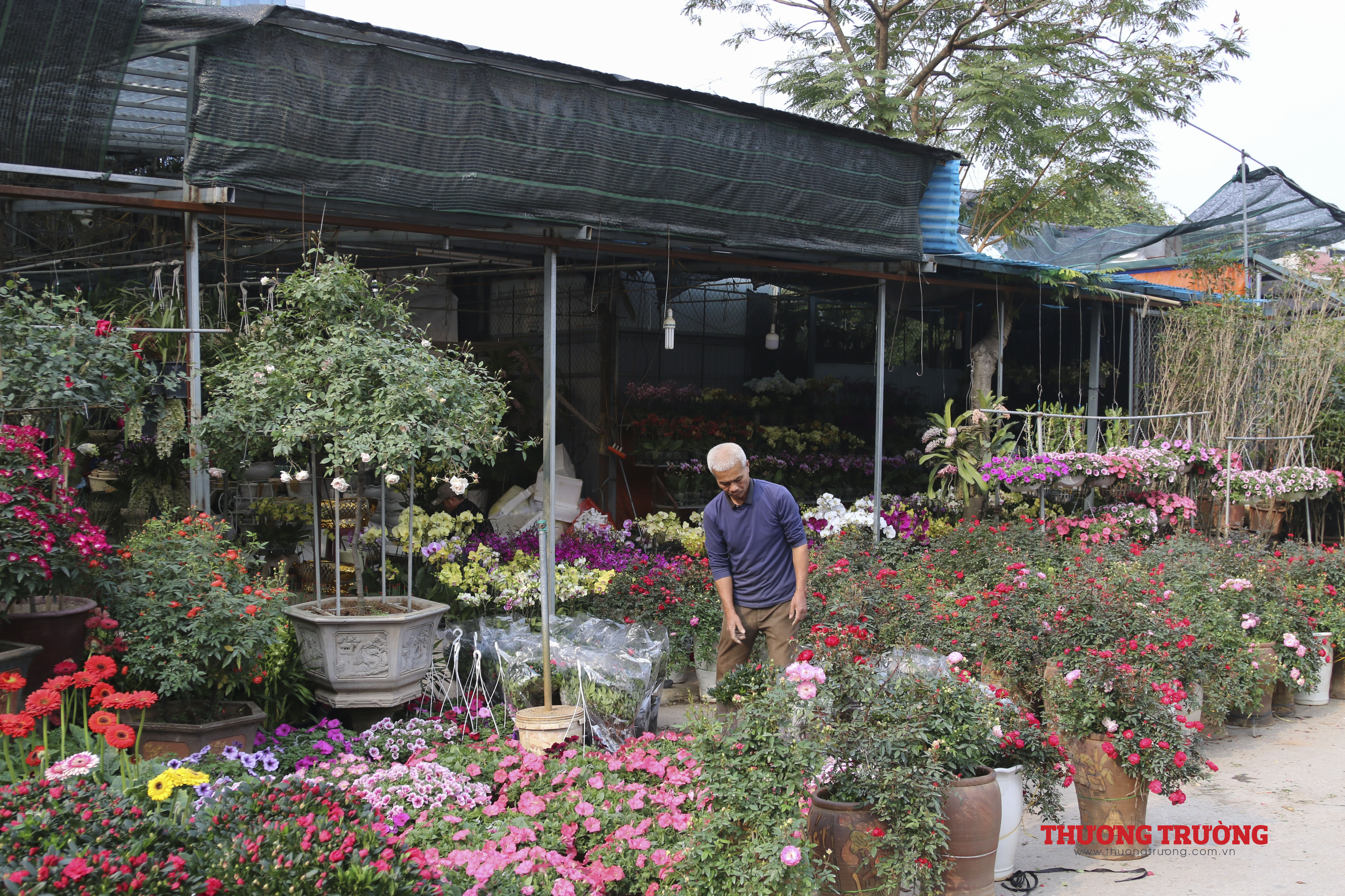 Còn khoảng 2 tuần nữa đến Tết, ngoài các nhà vườn có điểm bán cố định thì có tới hàng trăm người bán hàng kéo về từ những khu vực chuyên trồng hoa, cây cảnh lân cận như Chương Mỹ, Thường Tín, Văn Giang (Hưng Yên).