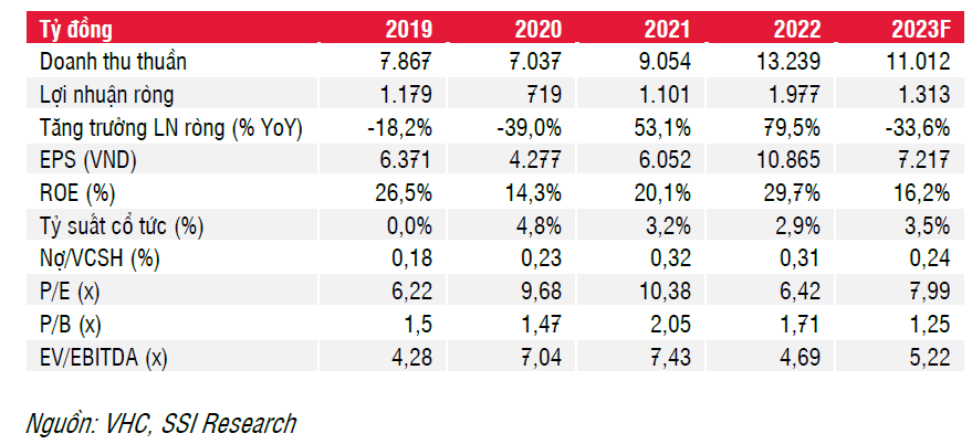 SSI Research giả định sản lượng tiêu thụ giảm 5% so với cùng kỳ (từ ước tính không đổi trước đó) và giá bán trung bình sẽ đạt 3,90 USD/kg (2022 là 4,70 USD/kg) trong năm 2023. SSI Research kỳ vọng sản lượng tiêu thụ sang thị trường châu Âu sẽ bù đắp một phần sụt giảm sản lượng tiêu thụ tại thị trường Mỹ trong nửa đầu năm 2023. Tuy nhiên, giá bán trung bình của sản phẩm bán sang châu Âu vẫn thấp hơn khoảng 15%-20% so với thị trường Mỹ. Do đó, SSI Research kỳ vọng tỷ suất lợi nhuận gộp của VHC sẽ đạt 18,7% trong năm 2023 (so với 22,5% cho năm 2022).