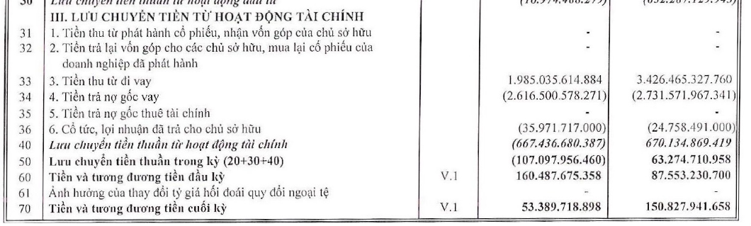 Lượng tiền mặt cuối kỳ là 53 tỷ đồng, giảm 67% so với đầu năm.