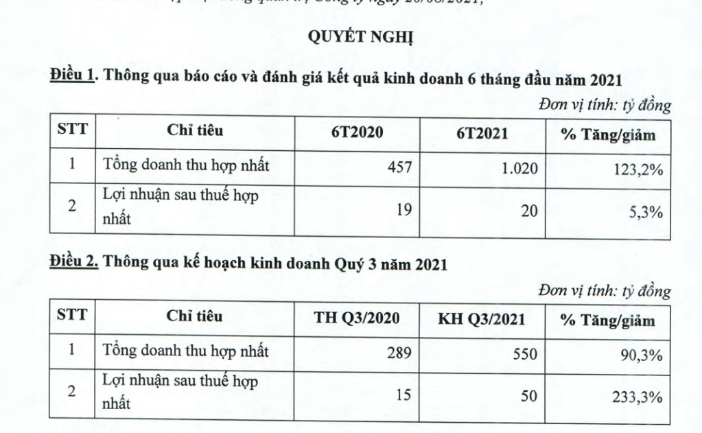 CTCP Nhựa Hà Nội (mã CK: NHH) đã thông qua KQKD 6 tháng đầu năm 2021 và kế hoạch kinh doanh quý 3/2021 với tổng doanh thu hợp nhất 550 tỷ đồng, lợi nhuận sau thuế 50 tỷ đồng, lần lượt tăng 90% và 233% so với cùng kỳ.