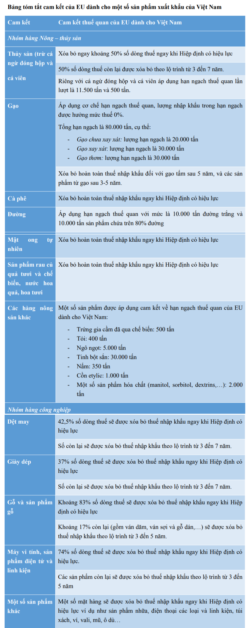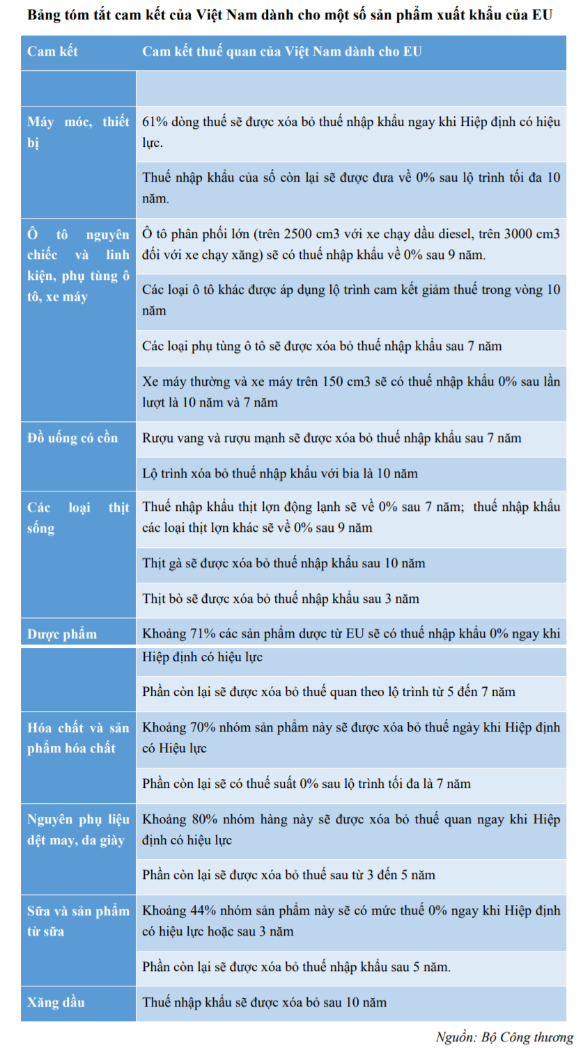Bảng tóm tắt cam kết của Việt Nam dành cho một số sản phẩm xuất khẩu của EU. (Nguồn: trungtamwto).