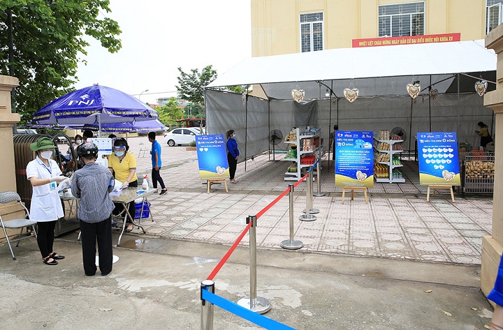 Mỗi siêu thị có hơn 60 mặt hàng được xếp ngay ngắn trên kệ từ thực phẩm khô, đến các thực phẩm tươi, gia vị, rau củ quả… trong đó có nhiều sản phẩm OCOP (mỗi xã một sản phẩm) của Hà Nội. Thông qua chính quyền địa phương, mỗi hộ gia đình được phát “Phiếu quà tặng” trị giá 400.000 đồng.