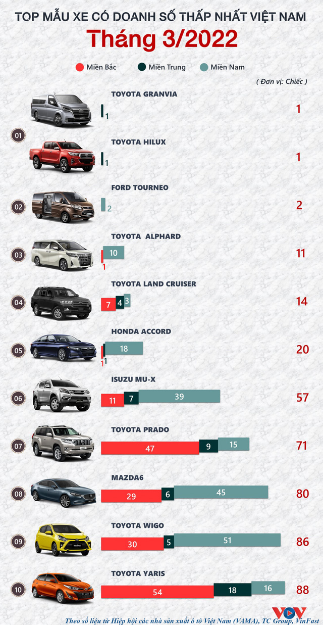 Cụ thể: Toyota Granvia bán được 1 xe, Toyota Hilux: 1 xe, Ford Tourneo: 2 xe, Toyota Alphard: 11 xe, Toyota Land Cruiser: 14 xe, Honda Accord: 20 xe, Isuzu mu-X: 57 xe, Toyota Land Prado: 71 xe, Mazda6: 80 xe, Toyota Wigo: 86 xe , Toyota Yaris: 88 xe.