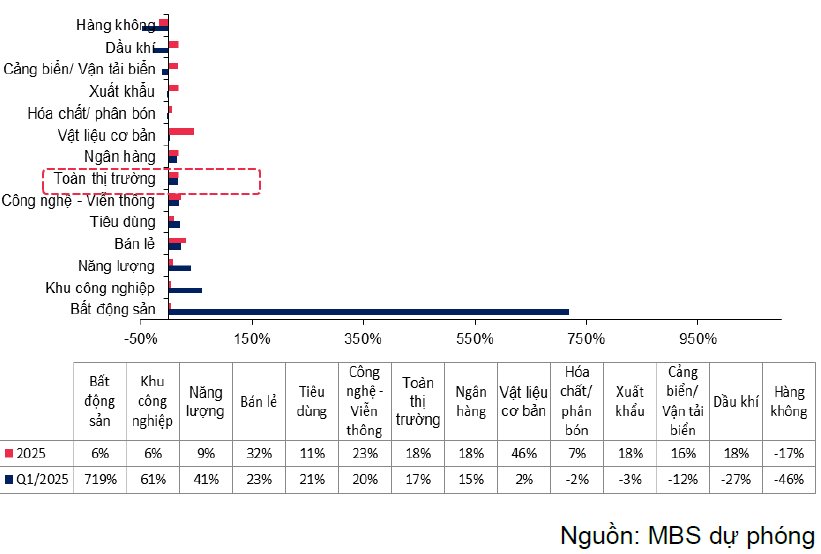 Trong Quý 1/2025, lợi nhuận ngành ngân hàng dự báo tăng trưởng 15% so với cùng kỳ nhờ tín dụng đã bắt đầu tăng tốc ngay từ đầu năm. Các ngành đạt mức tăng trưởng lợi nhuận Quý 1 nổi bật gồm Bất động sản (719% so với cùng kỳ), khu công nghiệp (61% so với cùng kỳ), năng lượng (41% so với cùng kỳ).Ngược lại, một số ngành ước tính tăng trưởng lợi nhuận giảm như hàng không (-46% so với cùng kỳ) do cùng kỳ năm ngoái có lợi nhuận đột biến hay dầu khí (-27% so với cùng kỳ) do giá dầu suy giảm so với cùng kỳ.