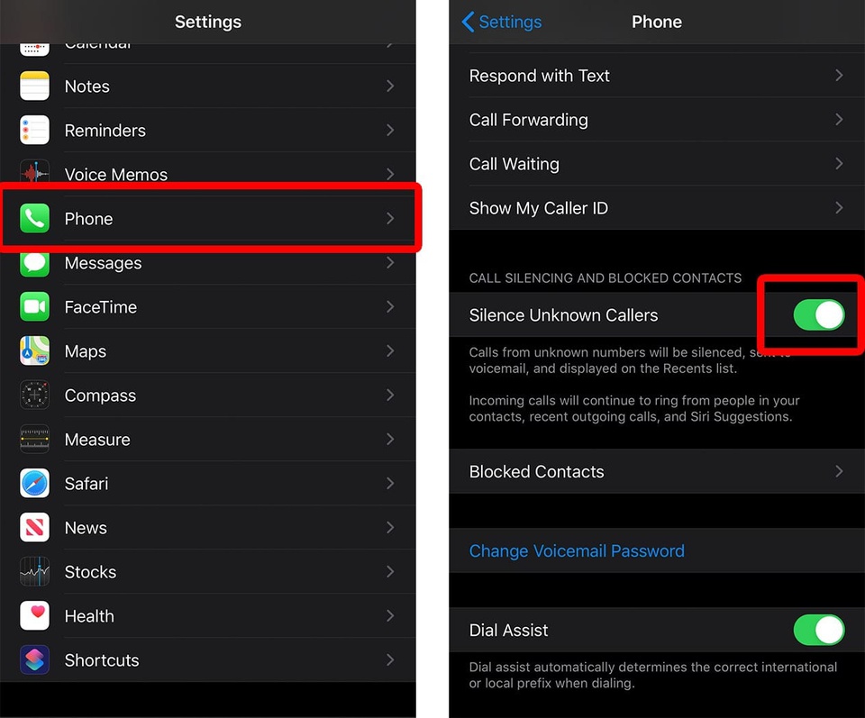 Tự động từ chối cuộc gọi lạ. Nếu thường xuyên bị quấy rầy bởi các cuộc gọi quảng cáo khi đang làm việc, bạn có thể bỏ qua bằng cách thêm những số không có trong danh bạ vào thư thoại. Để thực hiện việc này, hãy truy cập vào Cài đặt > Điện thoại, sau đó bật tùy chọn Tắt tiếng cuộc gọi không rõ. Khi đó, cuộc gọi đến từ số lạ sẽ tự động tắt tiếng, chuyển vào thư thoại và hiển thị trong danh sách Gần đây. Ảnh: HelloTech.