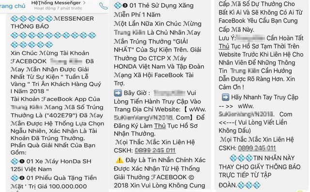 Cụ thể, các đối tượng lừa đảo sẽ thông báo qua tin nhắn người dùng với tài khoản có tên là "Hộp thư điện tử” thông báo trúng thưởng trong chương trình tri ân khách hàng cuối năm 2018 của Messenger. "Hộp thư điện tử” này cho biết người dùng may mắn có mã số trúng thưởng với phần quà là 1 xe máy Honda SH 150i trị giá 96 triệu đồng, 1 phiếu quà tặng 200 triệu đồng và 1 phiếu đổ xăng của Viettrolimex 100 triệu đồng.
