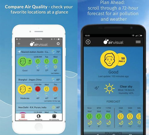AirVisual là ứng dụng cung cấp thông tin về mức độ ô nhiễm tại các thành phố trên thế giới theo thời gian thực cũng như dự đoán về tình trạng không khí tại các thời điểm trong ngày và các ngày trong tuần, từ đó cho phép người dùng sắp xếp chế độ sinh hoạt hay đi lại phù hợp.