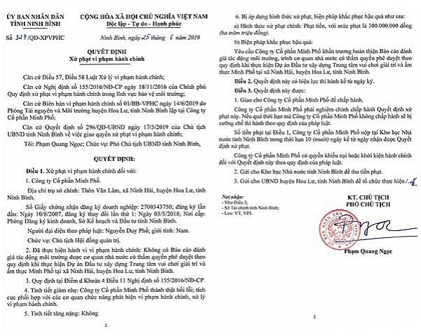 Công ty cổ phần Minh Phố vừa bị UBND tỉnh Ninh Bình xử phạt tiền 300 triệu đồng với vi phạm không có Báo cáo đánh giá tác động môi trường (ĐTM) khi thực hiện Dự án đầu tư xây dựng Trung tâm vui chơi giải trí và ẩm thực Minh Phố.
