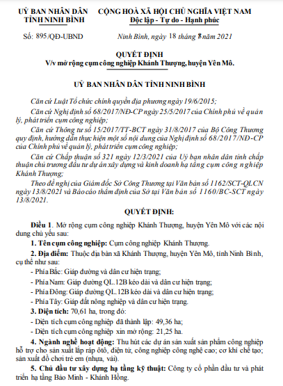 Theo quyết định này, UBND tỉnh cho phép mở rộng cụm công nghiệp Khánh Thượng, huyện Yên Mô lên diện tích 70,61ha. Trong đó, diện tích cụm công nghiệp đã thành lập từ trước là 49,36ha, diện tích cụm công nghiệp mở rộng là 21,25ha.