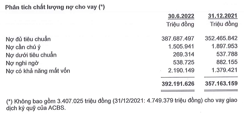 Tại thời điểm 30/6, ngân hàng có tổng dư nợ cho vay hơn 392.191 tỷ đồng. Về chất lượng, nợ xấu của ACB tăng mạnh chủ yếu đến từ việc nợ có khả năng mất vốn (nợ nhóm 5) tăng hơn 59% so với cùng kỳ và chiếm tới 73% tổng nợ xấu (2.998,2 tỷ đồng). Nợ dưới tiêu chuẩn và nợ nghi ngờ giảm mạnh nên tỷ lệ nợ xấu trên dư nợ vay giảm từ mức 0,78% đầu năm xuống còn 0,76%.