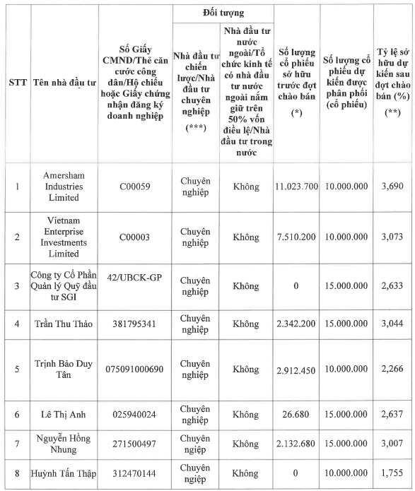 Danh sách nhà đầu tư do KBC đề xuất để chào bán 100 triệu cổ phiếu riêng lẻ. (Nguồn: KBC).