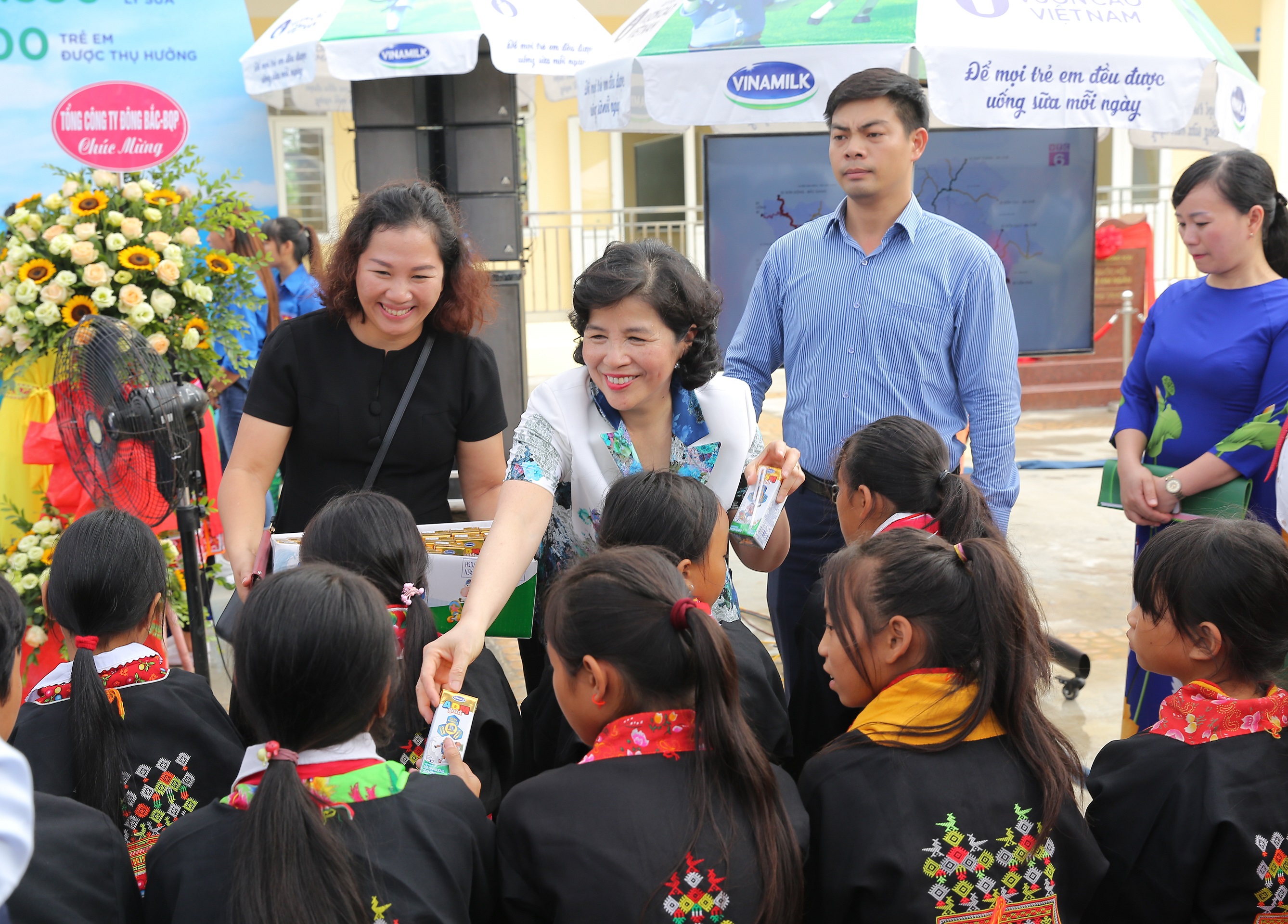 Bà Mai Kiều Liên - Thành viên Hội đồng Quản trị, Tổng Giám đốc Công ty Vinamilk trao tận tay các hộp sữa thơm ngon bổ dưỡng cho các em học sinh nghèo tại chương trình Quỹ sữa Vươn Cao Việt Nam ở Quảng Ninh.