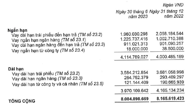 Theo báo cáo soát xét, tại ngày 30/6, HAGL có tổng dư nợ vay là 8.085 tỷ đồng, bao gồm 4.115 tỷ vay ngắn hạn và 3.970 tỷ dài hạn.
