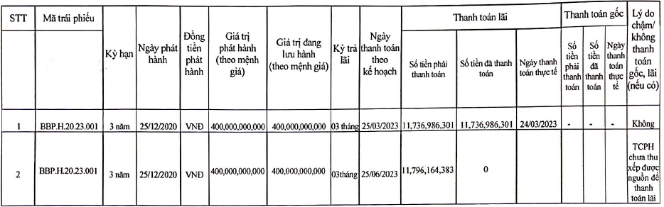 Trước đó, hồi tháng 3/2023, công ty đã có cuộc đàm phán với trái chủ về việc gia hạn thời hạn mua lại trái phiếu lô BBP.H.20.23.001. Theo đó, trái chủ cho phép công ty gia hạn thời gian mua lại trái phiếu ngay khi có thể nhưng không muộn hơn tiến độ như sau: ngày 25/7/2023 mua lại 15% (60 tỷ đồng), ngày 25/9/2023 mua lại 45% (180 tỷ đồng), ngày 25/12/2023 mua lại 40% (160 tỷ đồng).