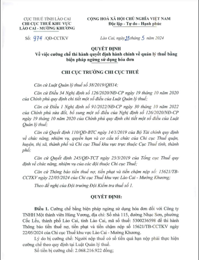 Theo Cục Thuế tỉnh Lào Cai, mới đây Chi cục Thuế khu vực Lào Cai – Mường Khương vừa ban hành Quyết định số 974/QĐ-CCTKV, về việc cưỡng chế thi hành quyết định hành chính về quản lý thuế bằng biện pháp ngừng sử dụng hóa đơn đối với Công ty TNHH MTV Hùng Vương.