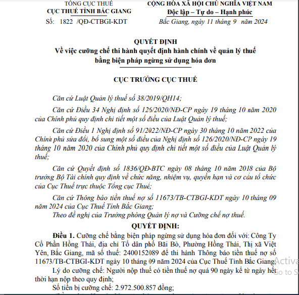 Cục Thuế tỉnh Bắc Giang đã ban hành Quyết định số 1822/QĐ-CTBGI-KDT ngày 11/9/2024, về việc cưỡng chế thi hành quyết định hành chính về quản lý thuế bằng biện pháp ngừng sử dụng hóa đơn đối với Công ty Cổ phần Hồng Thái do nợ thuế.