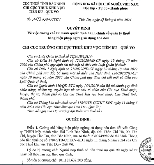 Cụ thể, theo Cục Thuế tỉnh Bắc Ninh, Chi cục Thuế khu vực Tiên Du – Quế Võ vừa ban hành Quyết định số 1152/QĐ-CCTKV ngày 17/6/2024, về việc cưỡng chế thi hành quyết định hành chính về quản lý thuế bằng biện pháp ngừng sử dụng hóa đơn đối với Công ty TNHH MTV Hải Linh Bắc Ninh.