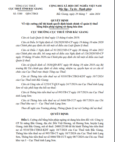 Quyết định về việc cưỡng chế thi hành quyết định hành chính về quản lý thuế bằng biện pháp ngừng sử dụng hóa đơn đối với Công ty CP Xi măng Bắc Giang