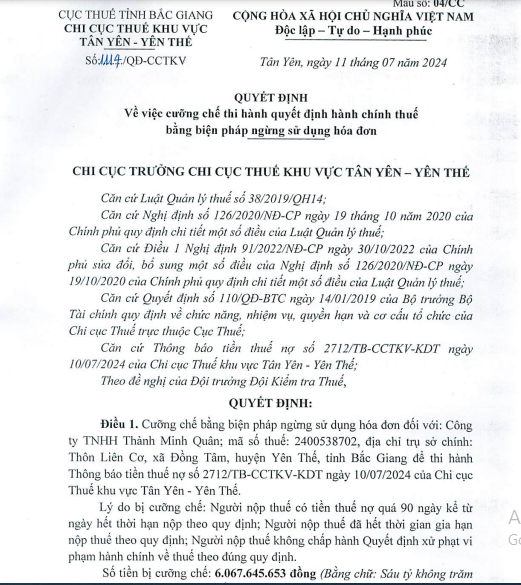 Công ty TNHH Thành Minh Quân (địa chỉ trụ sở chính: Thôn Liên Cơ, xã Đồng Tâm, huyện Yên Thế, tỉnh Bắc Giang. Mã số thuế: 2400538702) bị Cưỡng chế bằng biện pháp ngừng sử dụng hóa đơn để thi hành Thông báo tiền thuế nợ số 2712/TB-CCTKV-KDT ngày 10/7/2024 của Chi cục Thuế khu vực Tân Yên – Yên Thế.