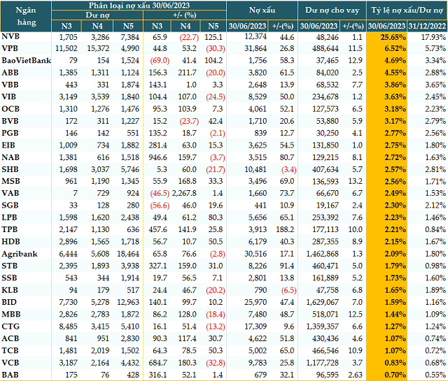 Chiều ngược lại, nợ nhóm 3 tại một số ngân hàng tăng bằng lần như Nam A Bank (NAB, gấp 10 lần), VCB (gấp 7.8 lần), TPBank (TPB, gấp 5.6 lần).