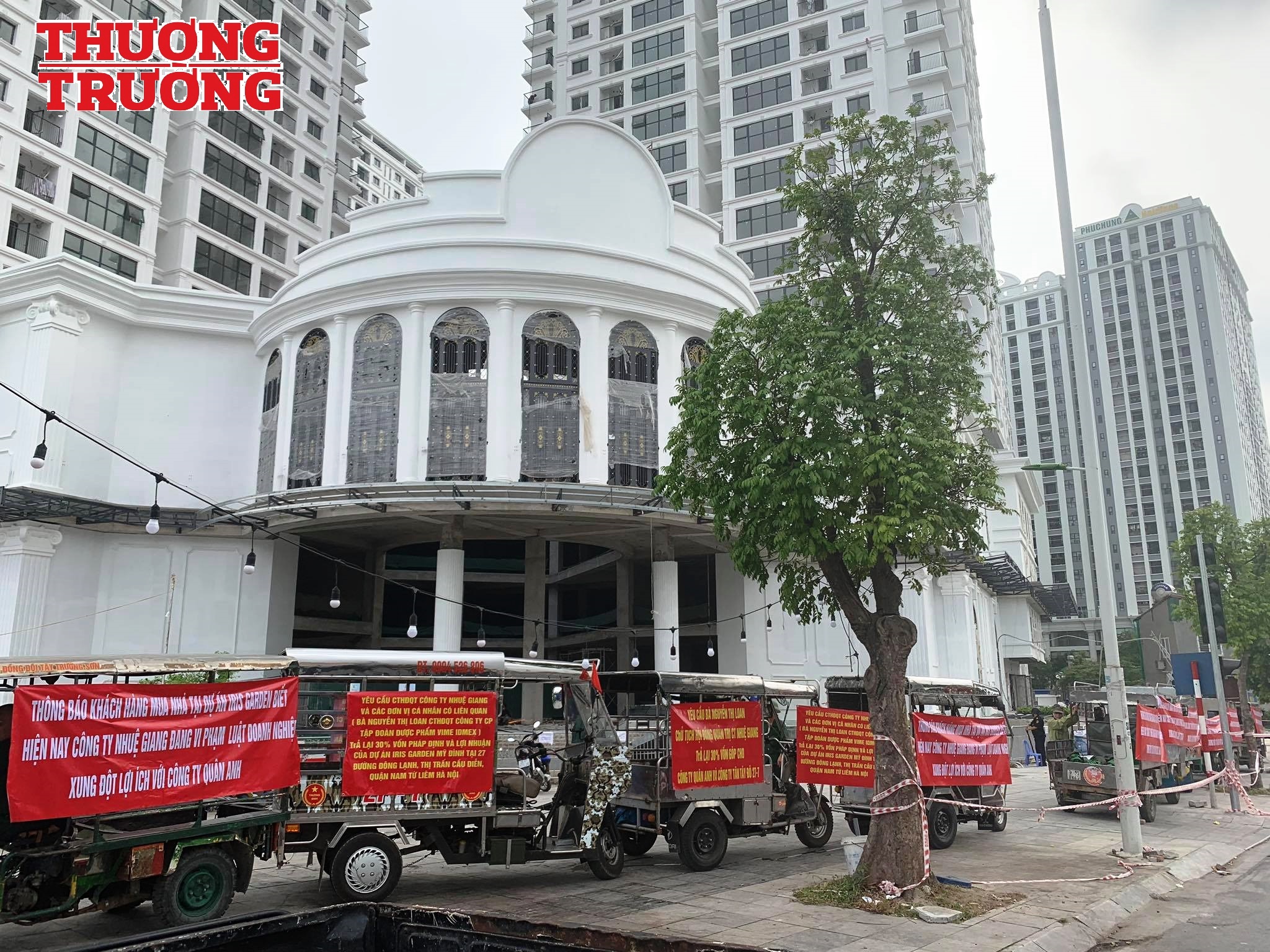 Cụ thể sáng nay, 31/7/2020, hàng trăm “cổ đông” của Công ty Quân Anh và Công ty Tân Tây Đô 27-7 đã đến xung quanh lối ra vào của dự án căng băng rôn phản đổi chủ đầu tư, yêu cầu Công ty Nhuệ Giang và Vimedimex chi trả quyền lợi và 30% vốn góp cho Công ty Quân Anh, đồng thời hai công ty này còn căng băng - dôn cảnh báo khách hàng.