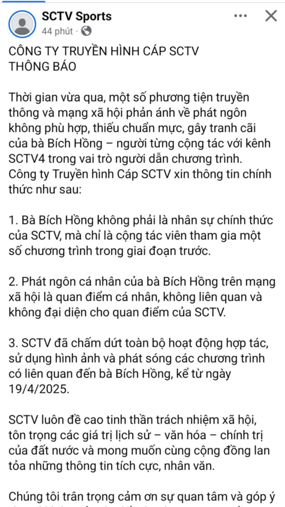 3. SCTV đã chấm dứt toàn bộ hoạt động hợp tác, sử dụng hình ảnh và phát sóng các chương trình có liên quan đến bà Bích Hồng, kể từ ngày 19/4/2025.