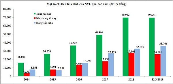 Giai đoạn 5 năm qua, quy mô tài sản của Novaland mở rộng rất nhanh, tại ngày 31/3/2019 tổng tài sản của Tập đoàn lên tới 69.661 tỷ đồng, gấp 4,3 lần so với cuối năm 2014, theo số liệu báo cáo tài chính hợp nhất quý I/2019. Việc liên tục gia tăng quỹ đất qua M&A, lợi nhuận tăng trưởng thần tốc kéo theo doanh nghiệp phải liên tục gia tăng nợ vay cũng như hàng tồn kho là điều tất yếu.