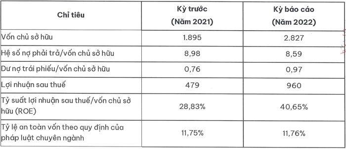 Đáng chú ý, hệ số nợ phải trả/vốn chủ sở hữu của Mcredit đã tăng từ 6,69 lần trong cùng kỳ năm trước lên 8,19 lần, tương ứng mức nợ phải trả tăng từ 21.087 tỷ đồng lên 24.881 tỷ đồng. Trong đó, dư nợ trái phiếu/vốn chủ sở hữu của công ty giảm từ 0,73 lần xuống còn 0,36 lần, tương đương mức dư nợ giảm từ 2.301 tỷ đồng xuống còn 1.094 tỷ đồng.