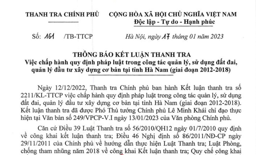 Thông báo kết luận chỉ rõ, UBND tỉnh Hà Nam thực hiện cơ chế hỗ trợ một phần chi phí đầu tư san nền, hạ tầng kỹ thuật đối với 4 dự án đã đầu tư vào Cụm công nghiệp Kiện Khê I, không đúng quy định với tổng số tiền trên 164 tỷ đồng gồm: Dự án nhà máy Hoa Sen Hà Nam 76,7 tỷ đồng; Nhà máy sữa Nutifood Hà Nam 31,2 đồng; Nhà máy sản xuất dược phẩm Hoa Thiên Phú gần 5,7 tỷ đồng. Đến ngày 18/6/2021, UBND tỉnh Hà Nam ban hành các quyết định thu hồi số tiền trên 164 tỷ đồng hỗ trợ không đúng nêu trên.